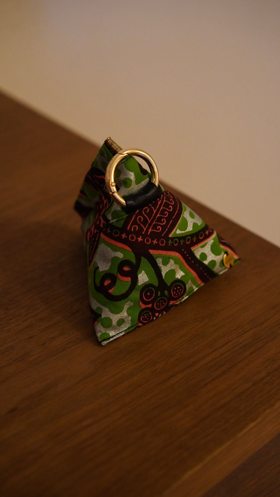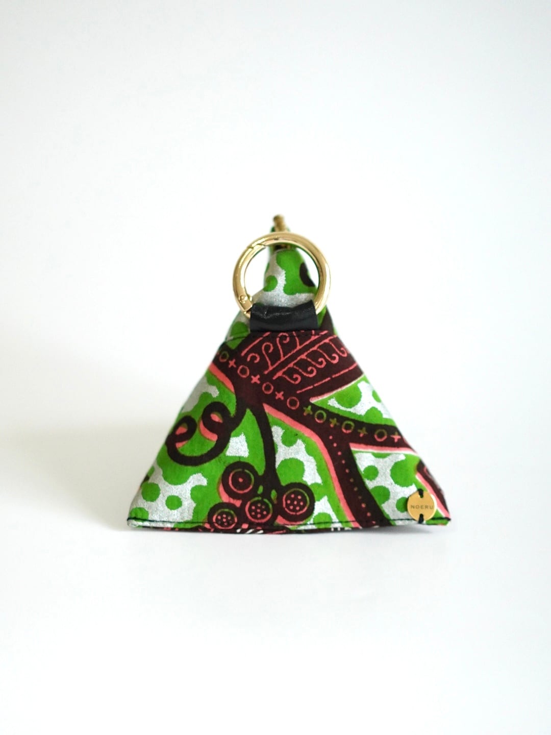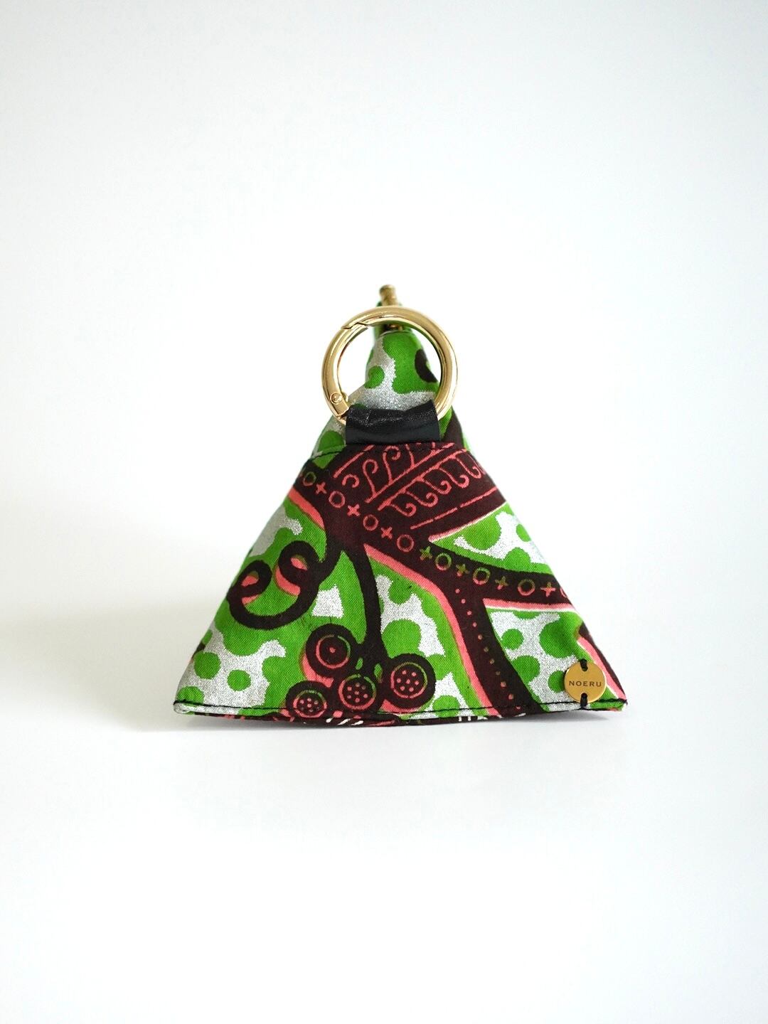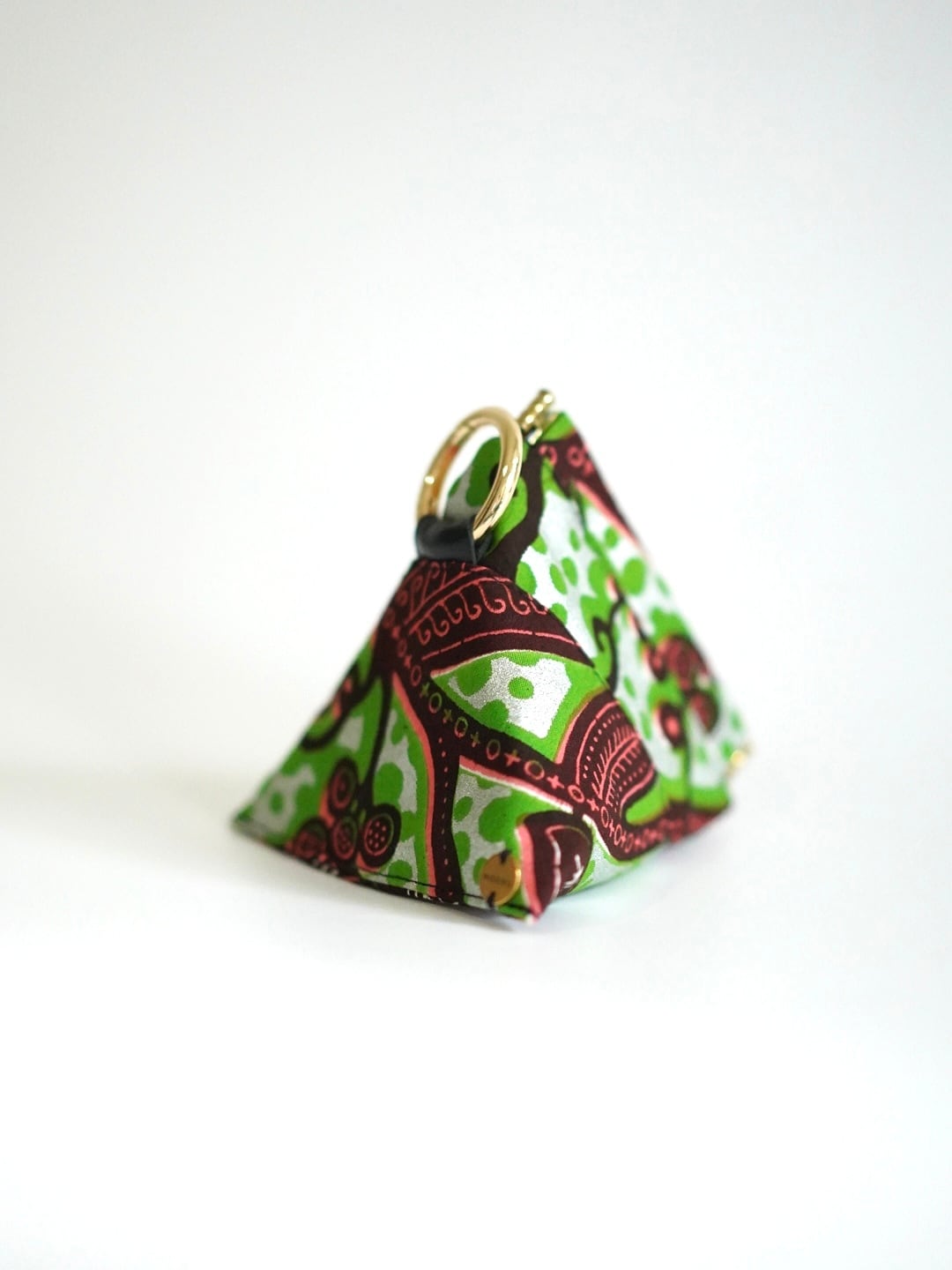 三角形のバネ口ポーチ。愛らしい手のひらサイズ。リング接続部分のテープは本革なので耐久性/高級感があります。バッグのチャームとして。ポーチとしてさっと取り出したいair pods/鍵/リップ/目薬等を入れるのもオススメ。