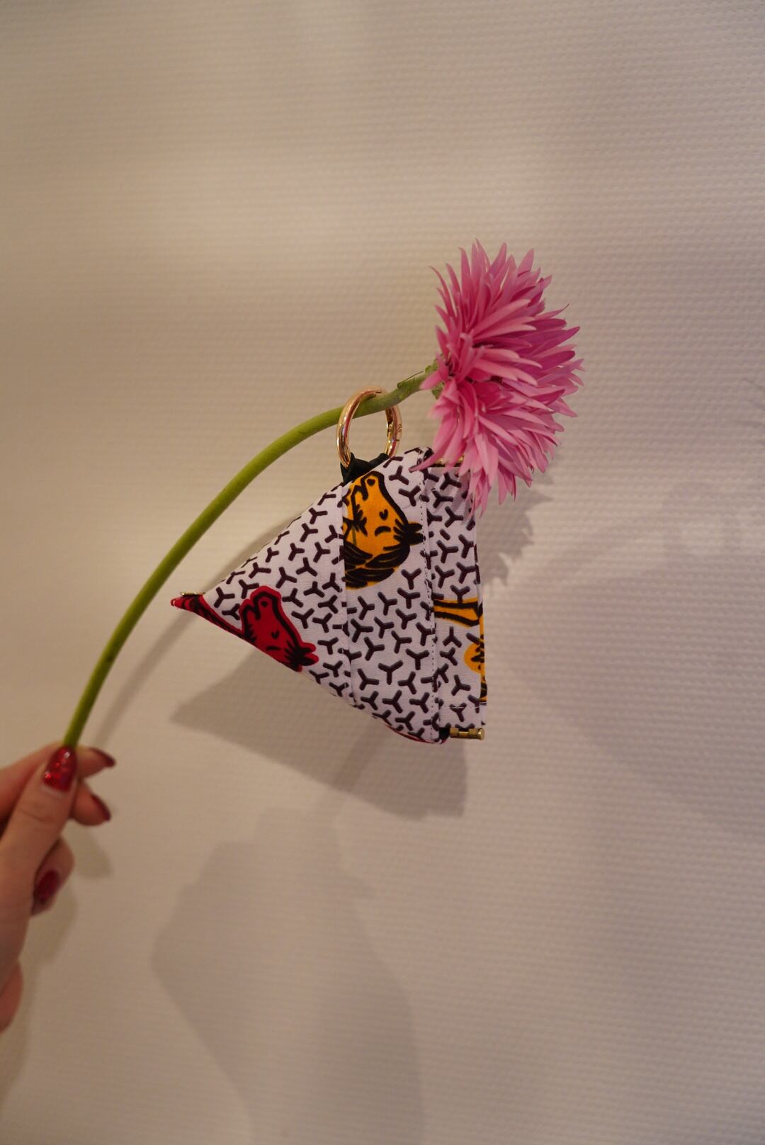 三角形のバネ口ポーチ。愛らしい手のひらサイズ。リング接続部分のテープは本革なので耐久性/高級感があります。バッグのチャームとして。ポーチとしてさっと取り出したいair pods/鍵/リップ/目薬等を入れるのもオススメ。