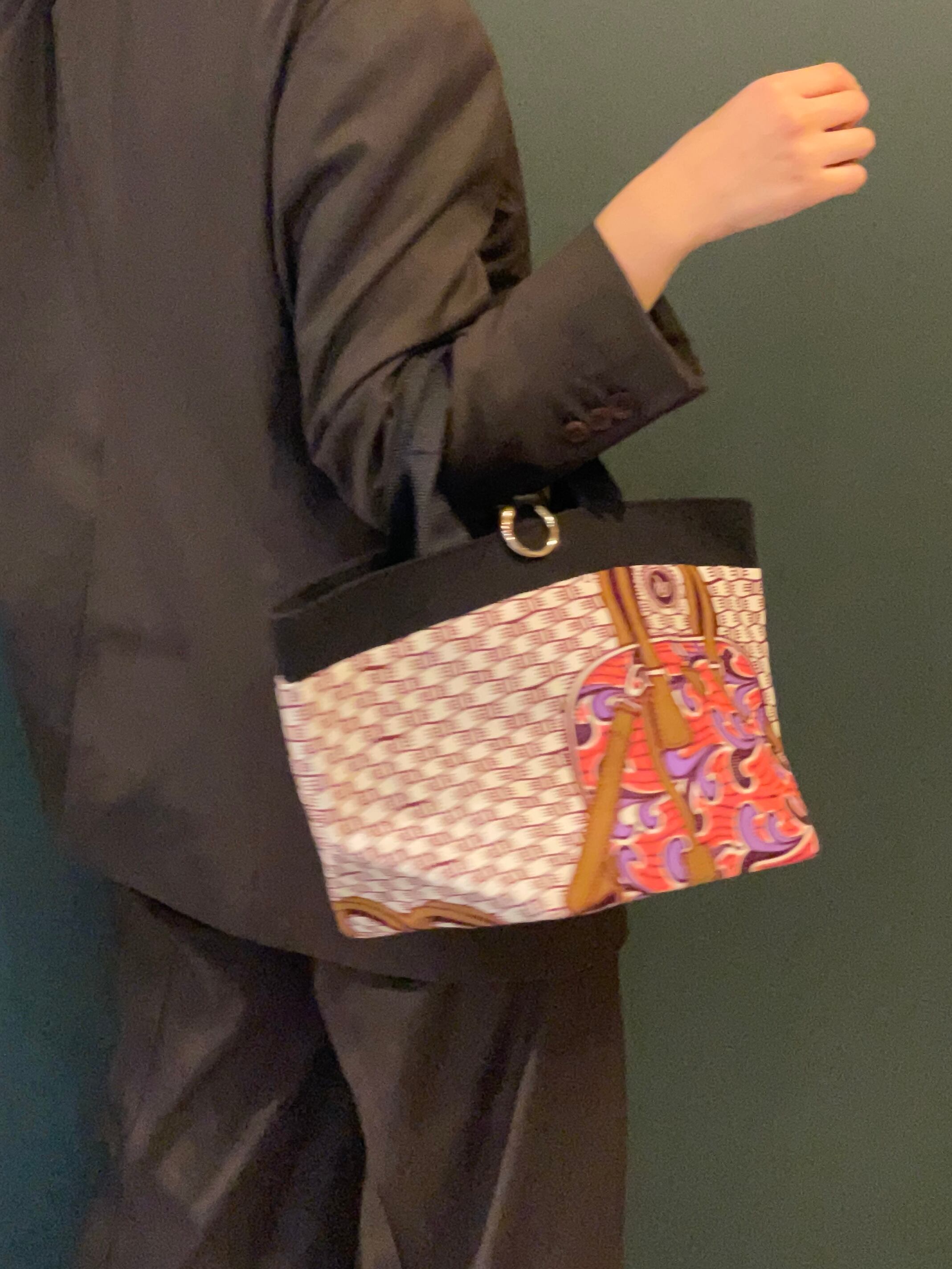 帆布(黒)×アフリカンファブリックの1点物リバーシブルバッグ。