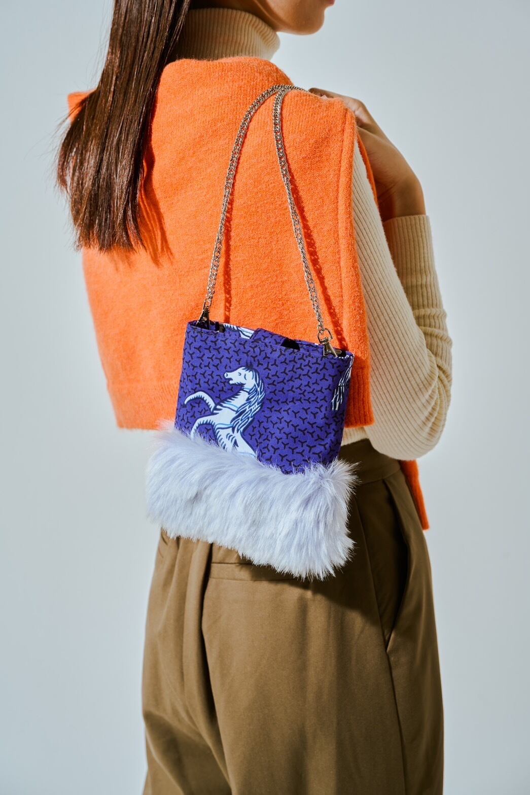 柔らかく艶やかなエコファーと、存在感のある柄生地を組み合わせたミニバッグ。日本製の上質なエコファーは、手に取るたびに贅沢な質感を感じられます。コンパクトながら印象的。コーディネートを格上げしてくれます。秋冬から春先まで、シーズンを超えて活躍します。