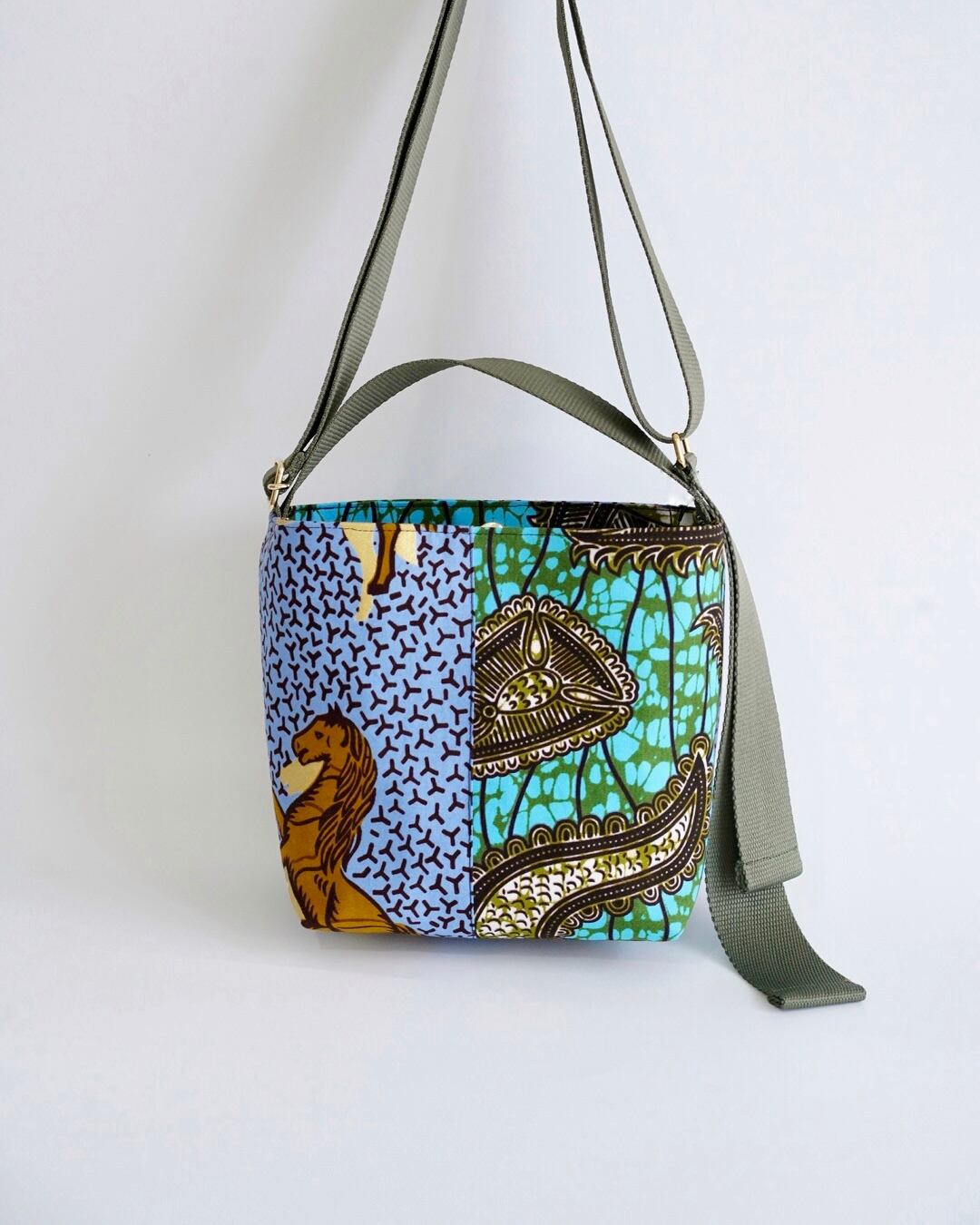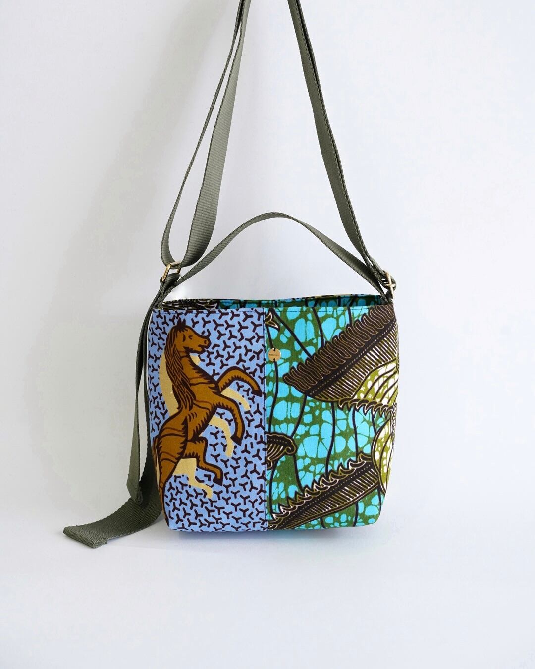 異なる2種類のアフリカンファブリックを贅沢に使用し、唯一無二のアートのような存在感を演出。馬の柄にはゴールドの箔が煌めき、持つだけで装いを格上げしてくれるバッグです。